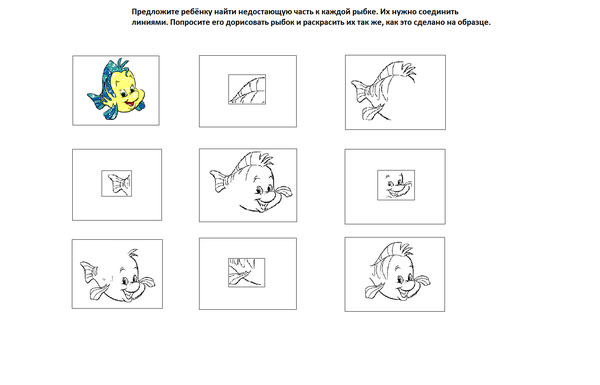 В данной работе ребёнку предлагается найти недостающую часть к каждой рыбке. Их нужно соединить линиями и раскрасить так же, как это сделано на образце.