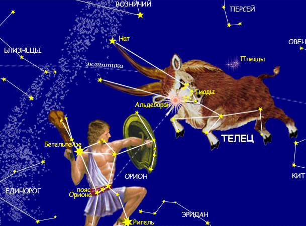 Еще одним большим и невообразимо красивым созвездием северного полушария является Телец. Оно располагается на северо-западе от Ориона и находится между созвездиями Овен и Близнецы. Недалеко от Тельца расположены таким созвездия, как: Возничий, Кит, Персей, Эридан.