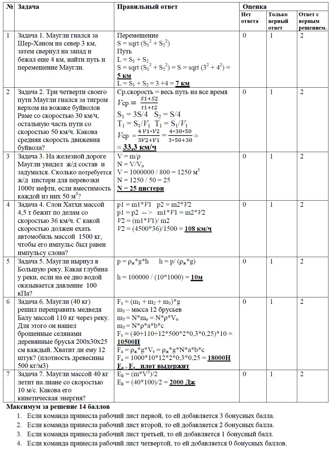 6. Оценивание. Решение каждой из 7 задач оценивается от 1 до 2 баллов, если есть только верный ответ без решения, то 1 балл, если есть верное решение и ответ, то 2 балла. Для 4 команд: команда, сдавшая заполненный рабочий лист первой, за скорость добавляет 3 бонусных балла, вторая команда добавляет 2 бонусных балла за скорость, третья – 1 бонусный балл, команда прибывшая с рабочим листом последней, не получает бонусных баллов.
