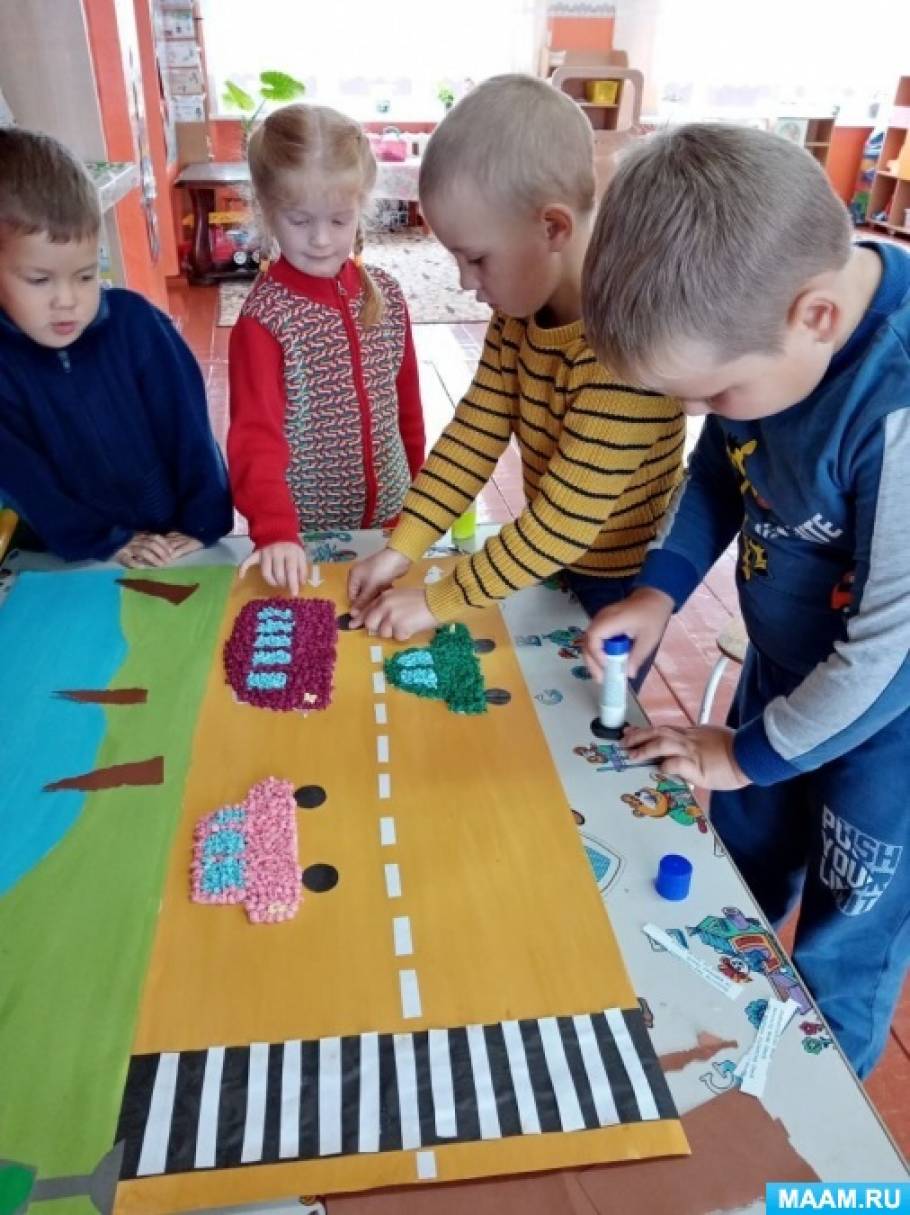 Мальчики клеили машины и светофор, созданный заранее из цветной бумаги