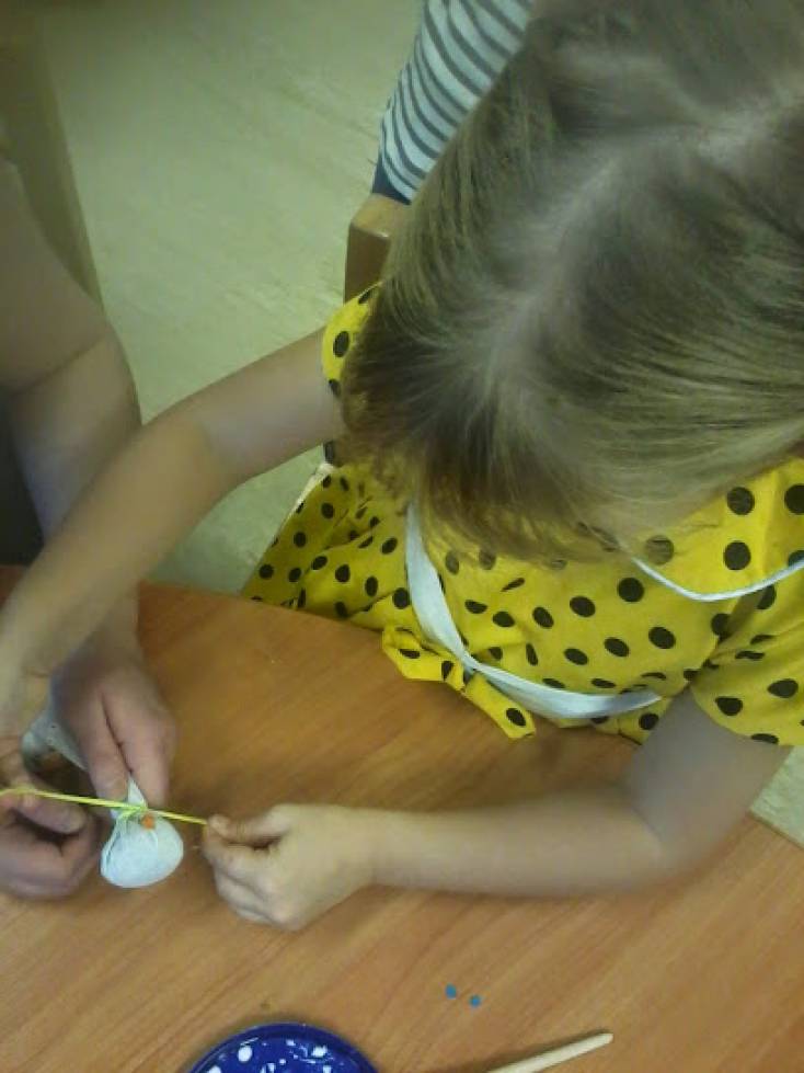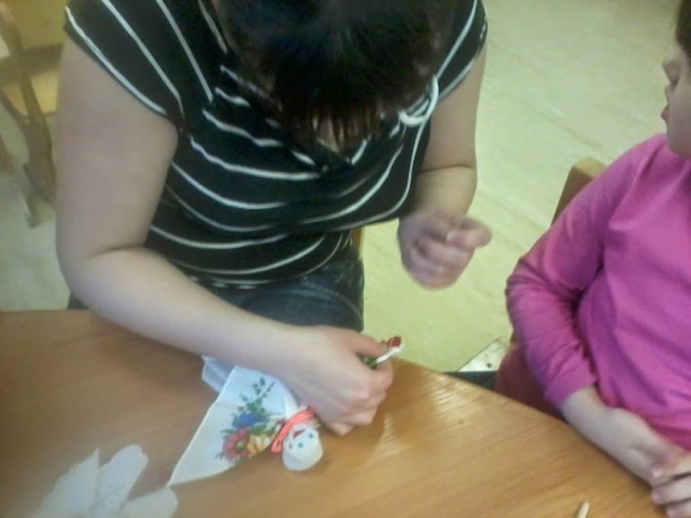 3. Аккуратно собрать кончики платка так, стобы получилась головка куклы и "платьице".