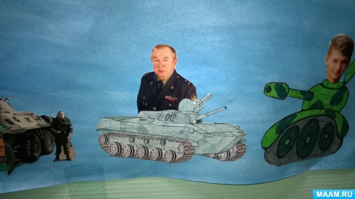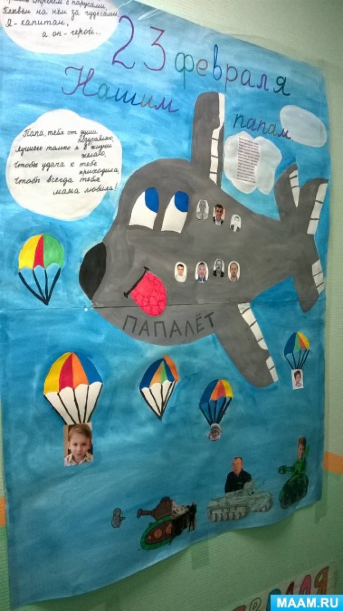 Например, к празднику 23 февраля мы решили поздравить всех мужчин нашей группы. Родители искали фото пап, дедушек, братьев и детей-мальчиков. А мы все вместе потом рисовали плакат, наклеивали фото.