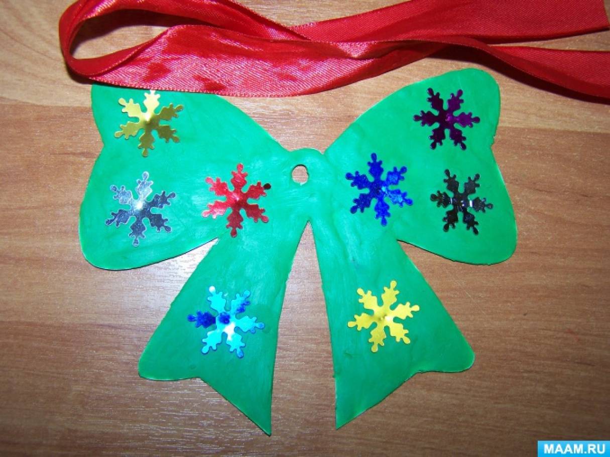 Воспитатель: далее берём снежинки (пайетки), которые лежат перед вами, прикладываем к бантику на пластилин и прижимаем с помощью стеки. Вставляем ленточку и получилась новогодняя игрушка «Бантик».