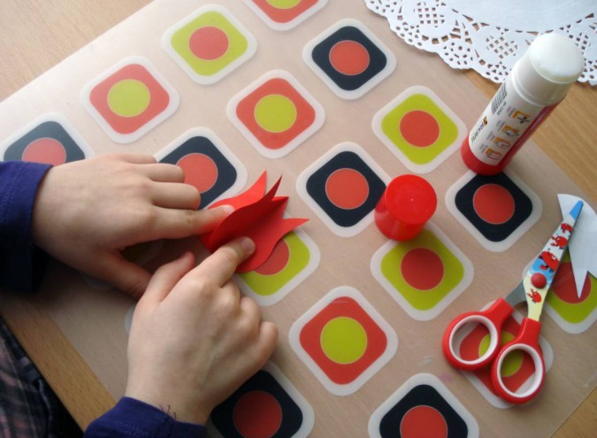 Полоску красной бумаги складываем пополам, прикладываем шаблон половинки тюльпана и обводим его карандашом.