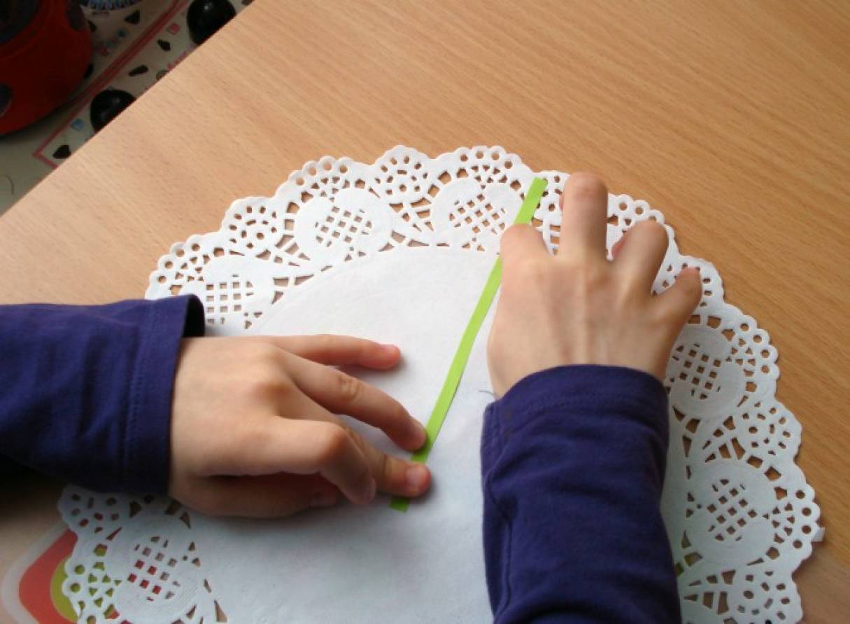Вырезаем полоски - стебельки и наклеиваем их на ажурную салфетку.