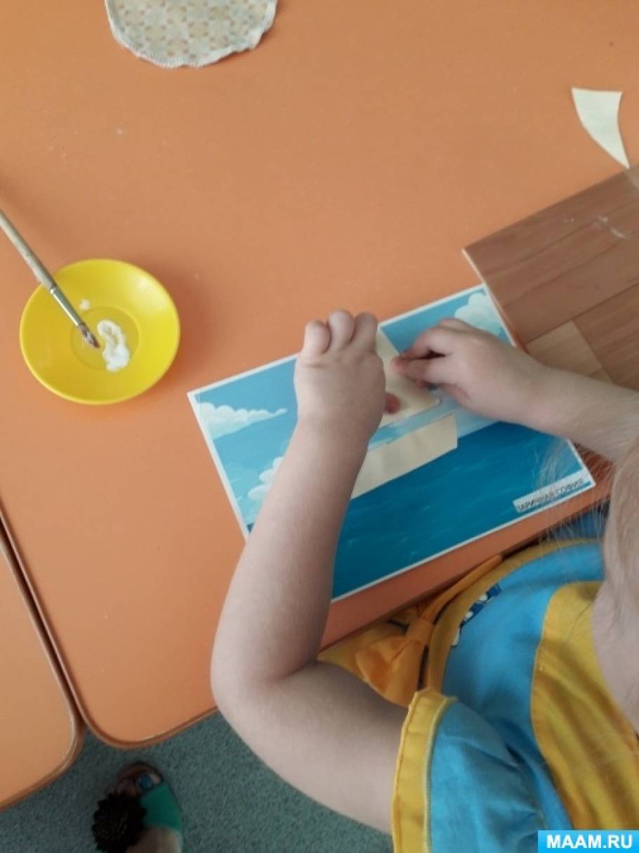 Какими словами начиналось стихотворение? «Плыл кораблик по волнам». У нас есть волны, теперь нужно сделать кораблик. Тогда приклеивайте кораблик. Напоминаю, что кораблик нужно положить на клеенку цветной стороной вниз и намазать клеем. Затем мы аккуратно берем его, прикладываем сверху на волны и осторожно промакиваем салфеткой.