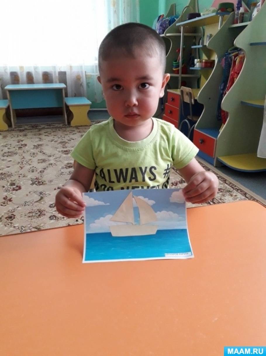 Оборудование: детали вырезанные из цветной бумаги кораблик, парус (по количеству детей, оборудование для аппликации.