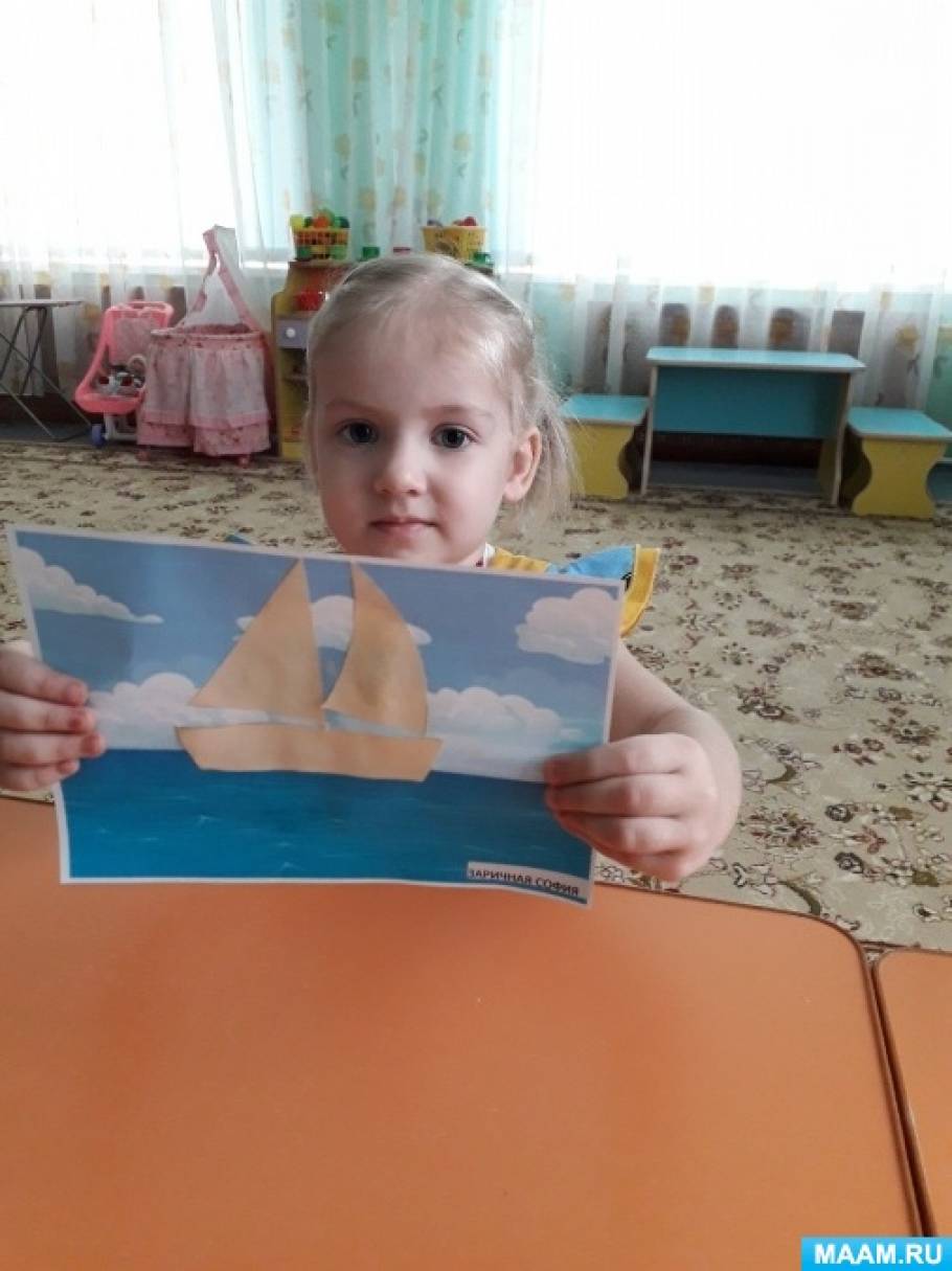 Программное содержание: учить наклеивать изображение соответственно замыслу; познакомить детей с отрывком стихотворения «Кораблик» Светланы Сирены (Котляр); учить детей понимать образность поэзии; ввести в словарь детей слова «капитан», «парусник» и познакомить с их значением; вызвать интерес к созданию образа; развивать воображение, чувство композиции, мелкую моторику; воспитывать интерес к изобразительной деятельности, аккуратность при выполнении работы.