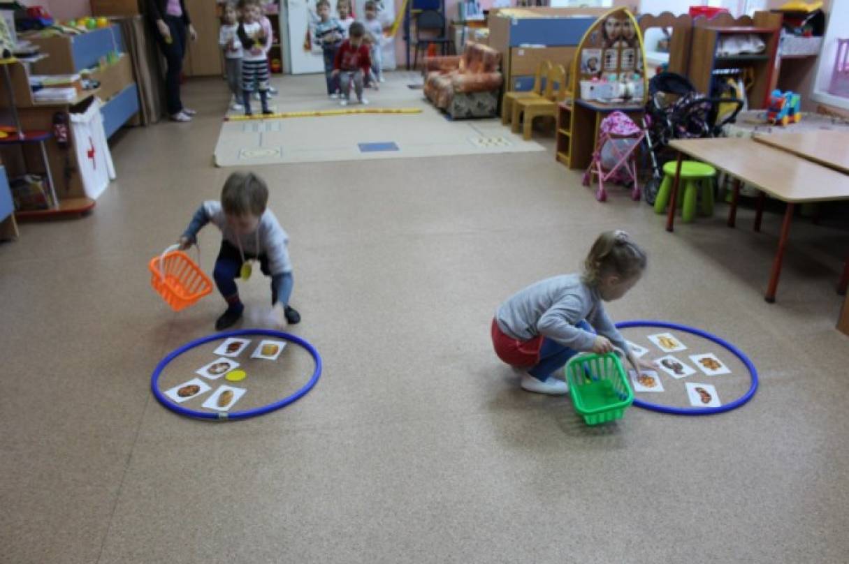 Ход: на полу в хаотичном порядке разложены зернышки. Под музыкальное сопровождение дети ходят (прыгают, бегают) по залу. По окончании мелодии игроки быстро берут по одному зернышку (каждая команда собирает свой цвет).