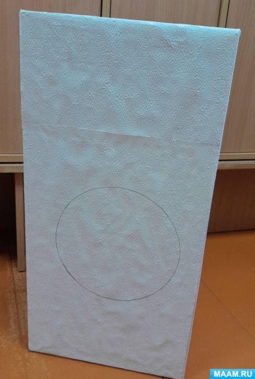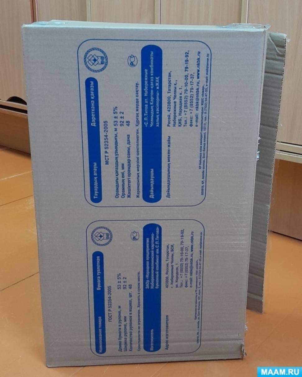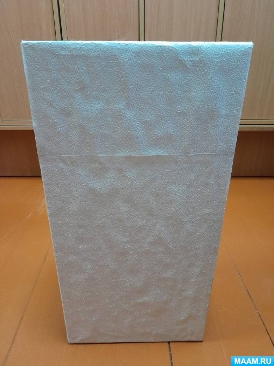 подобрать коробку без надписей и картинок. У меня такой коробки не оказалось,поэтому я сначала обклеила коробку белой бумагой. Для работы мне понадобилось: картонная коробка среднего размера, клей ПВА,ножницы,фломастеры,прозрачный скотч,чёрный маркер. Можно взять коробку намного больше. Алгоритм создания: 1) Поставить коробку в вертикальное положение 1)Сначала нужно обклеить коробку белой бумагой.