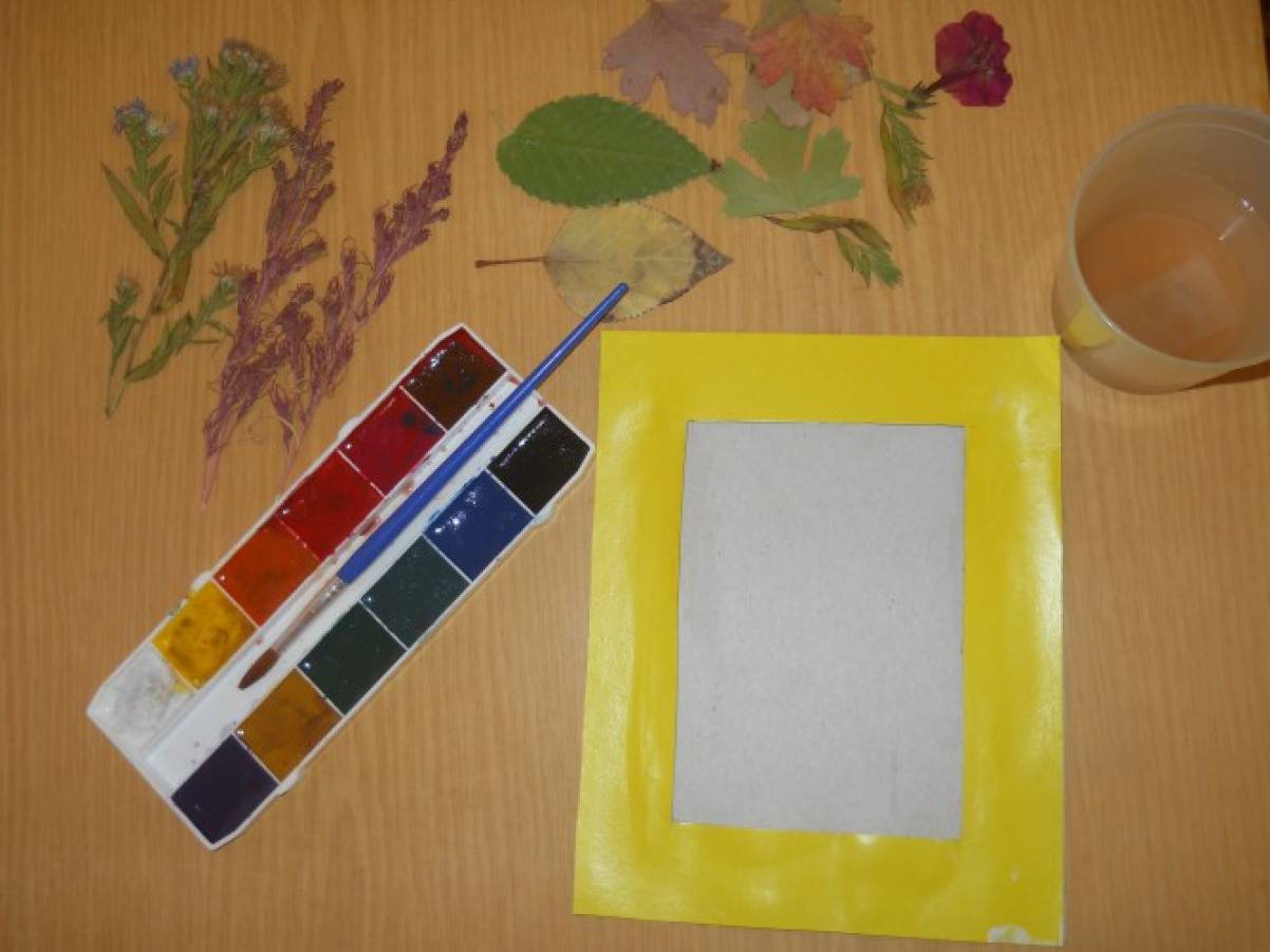 1. Для работы потребуется: два листа картона размером 15см. на19 см. ; карандаш, клей, ножницы,акварельные краски, кисточка, ёмкость для воды,засушенные листья и цветы.