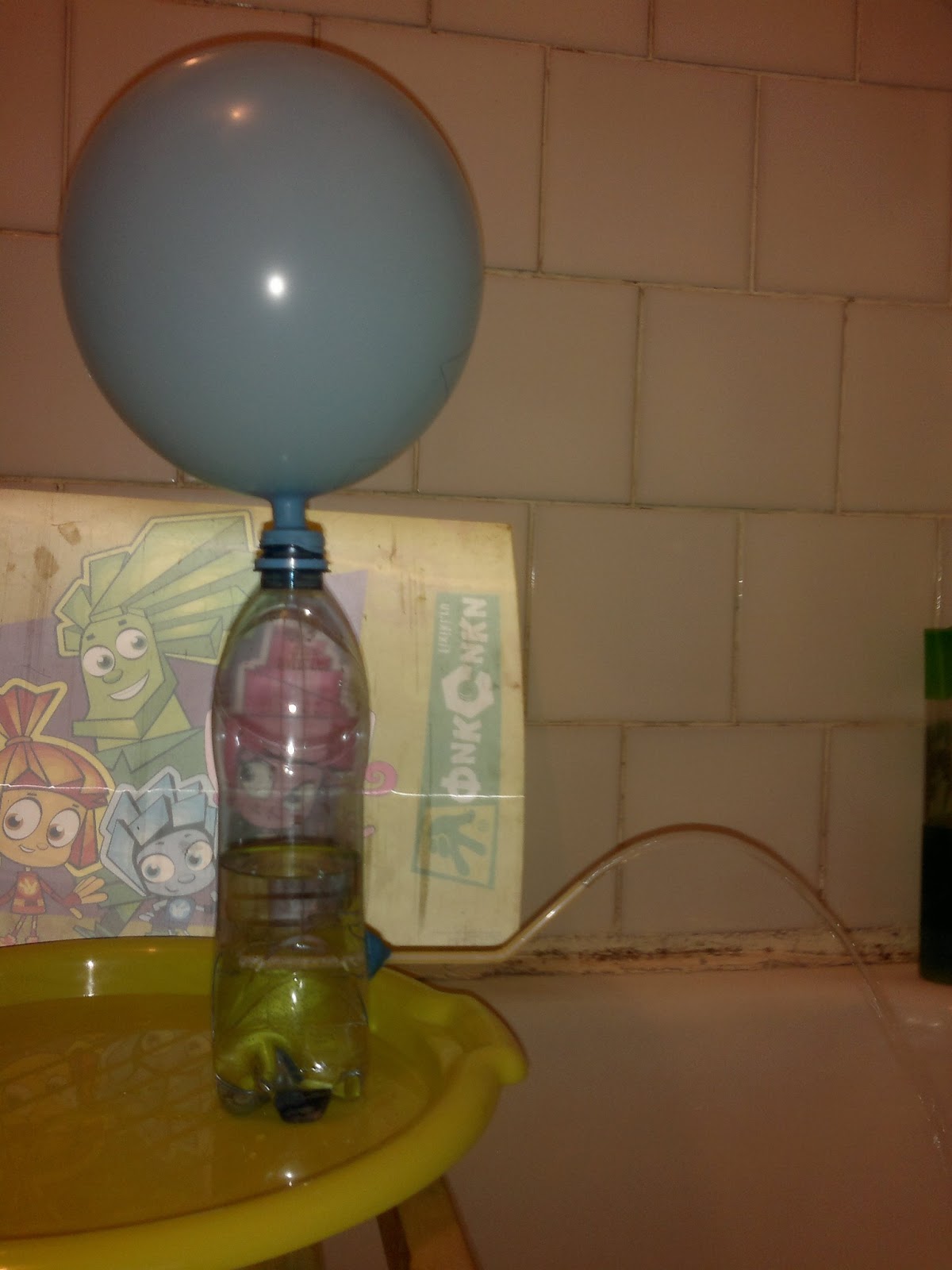 Делаем отверстие в бутылке, вставляем трубочку и затыкаем ее кусочком пластилина, набираем воды, надуваем шарик и крепим его к горлышку бутылки, можно закрыть шарик прищепкой на время.