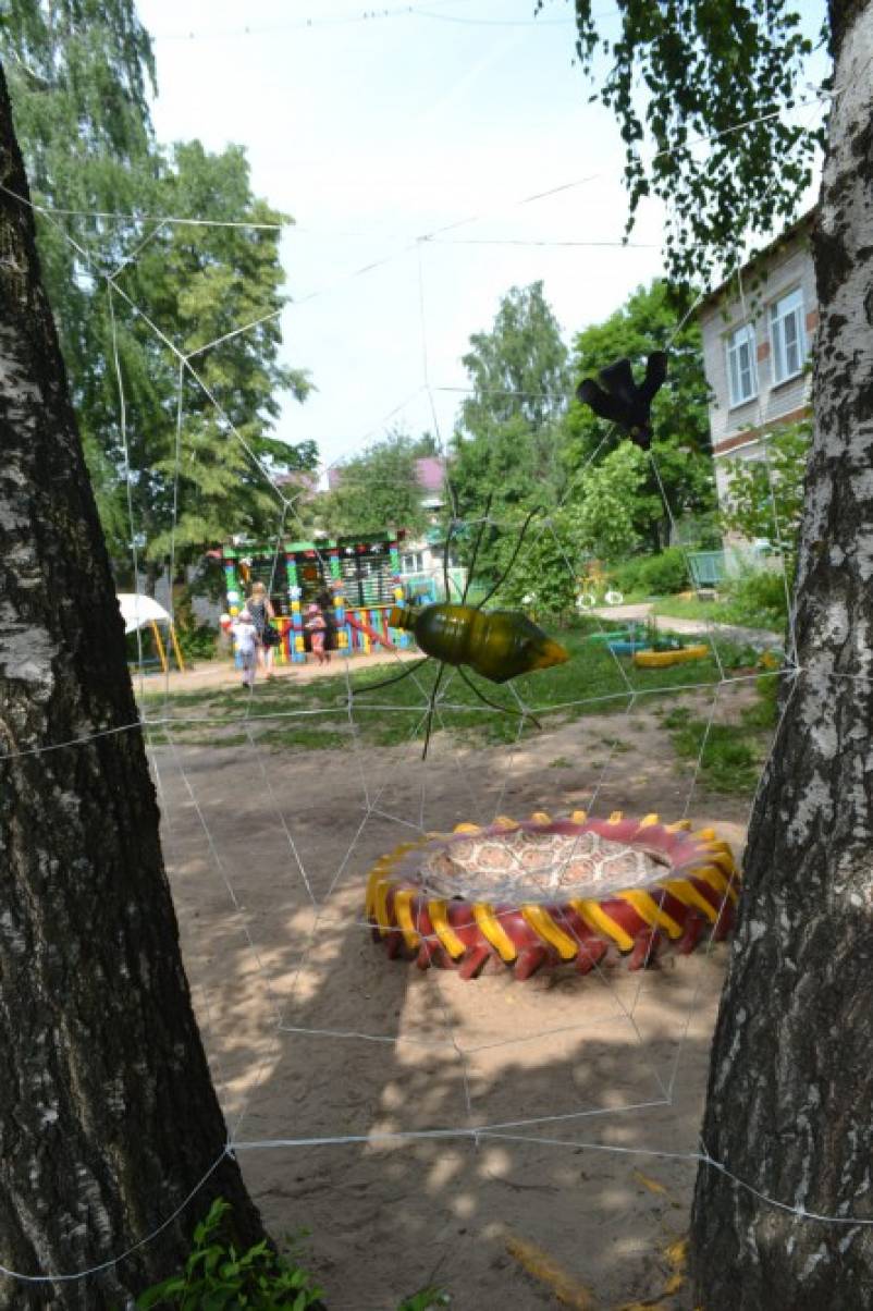 Между берез большой паук свил паутину и попалась в эту паутину муха. Рядом с паутиной приземлилась Баба Яга. В этом уголке мы может читать сказки : Муху Цокотуху, и все сказки где есть Баба Яга.