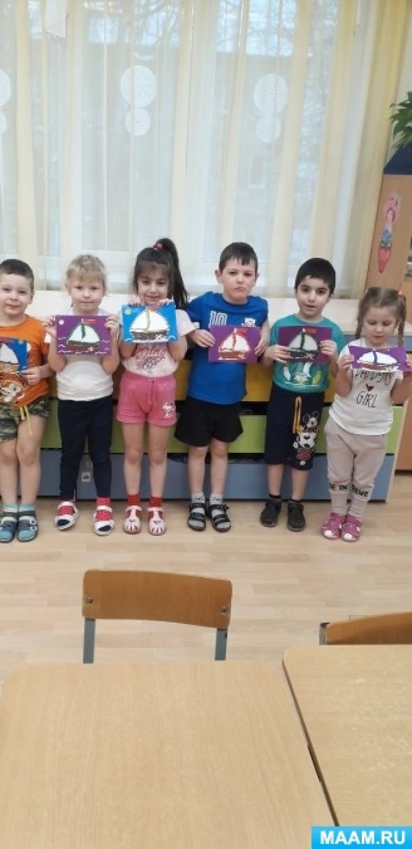 Так как мы живем в городе Калининград, а он омывается Балтийским морем, мы попросили родителей сходить с детьми к морскому рыбному порту и посмотреть на пришвартовавшийся Крузенштерн, который вернулся из дальнего похода. Ребята были просто в восторге от красоты такого парусника. И мы решили с ними вместе сделать своими руками аппликацию "Мой маленький Крузенштерн". Ребята были сами кораблестроителями.