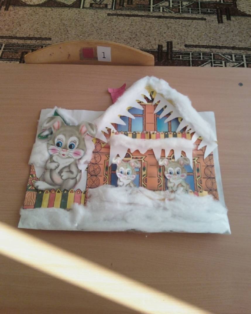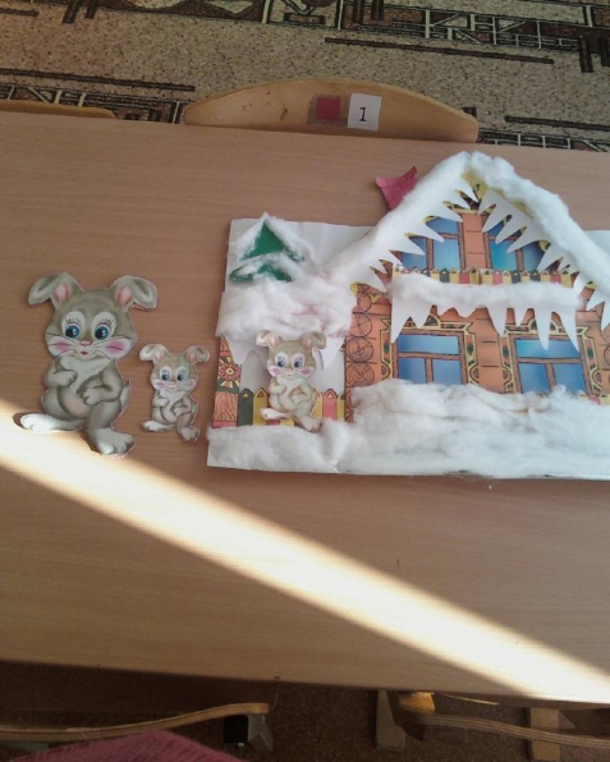 Средства: чудесный мешочек, плакат большие и маленькие следы, пластиковый стаканчик и трубочка (на каждого ребенка, домик, плоскостные фигуры зайчиха с зайчатами, магнитофон.