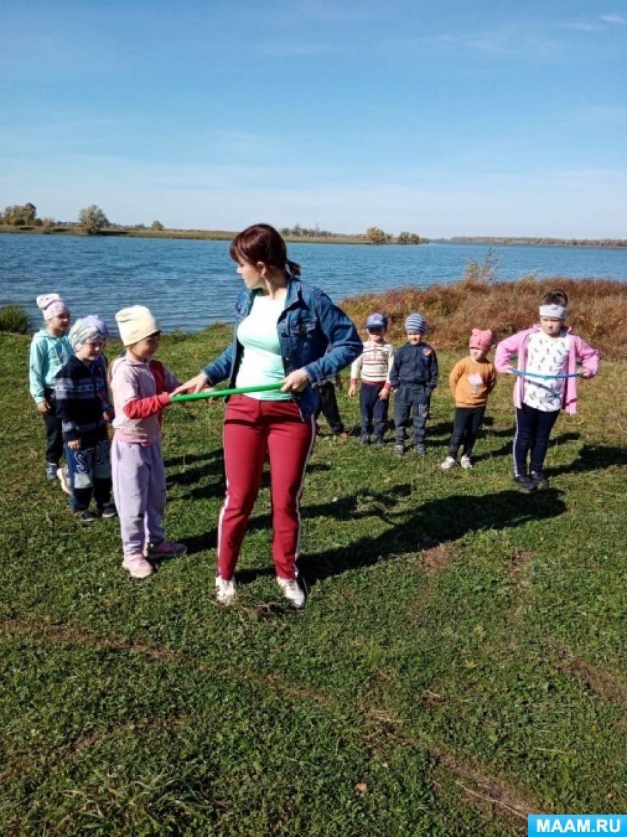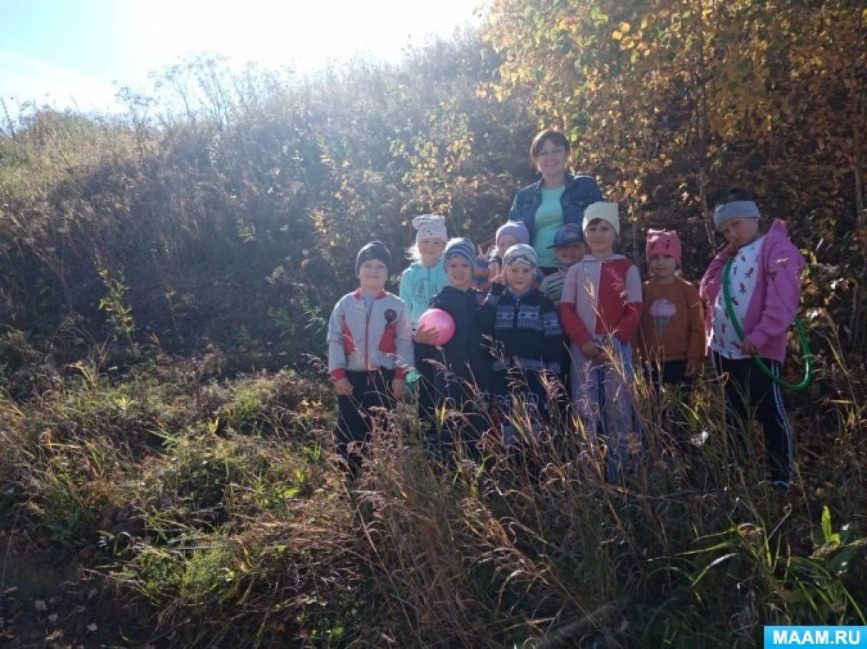 День выдался очень теплым и солнечным, с погодой нам повезло. Прежде чем выйти за пределы детского сада – воспитатель закрепил с детьми правила поведения на природе. По дороге мы любовались осенней природой, пели песни.