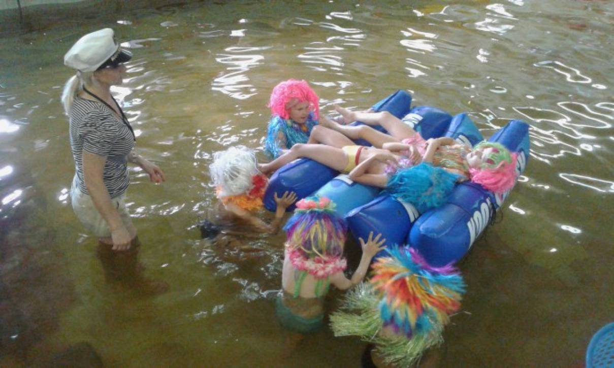Оборудование: спасательные пояса, надувные круги, надувные брёвна, веревка, цветные парики, обручи, дуги, гимнастические палки, надувной осьминог, надувная голова слона.