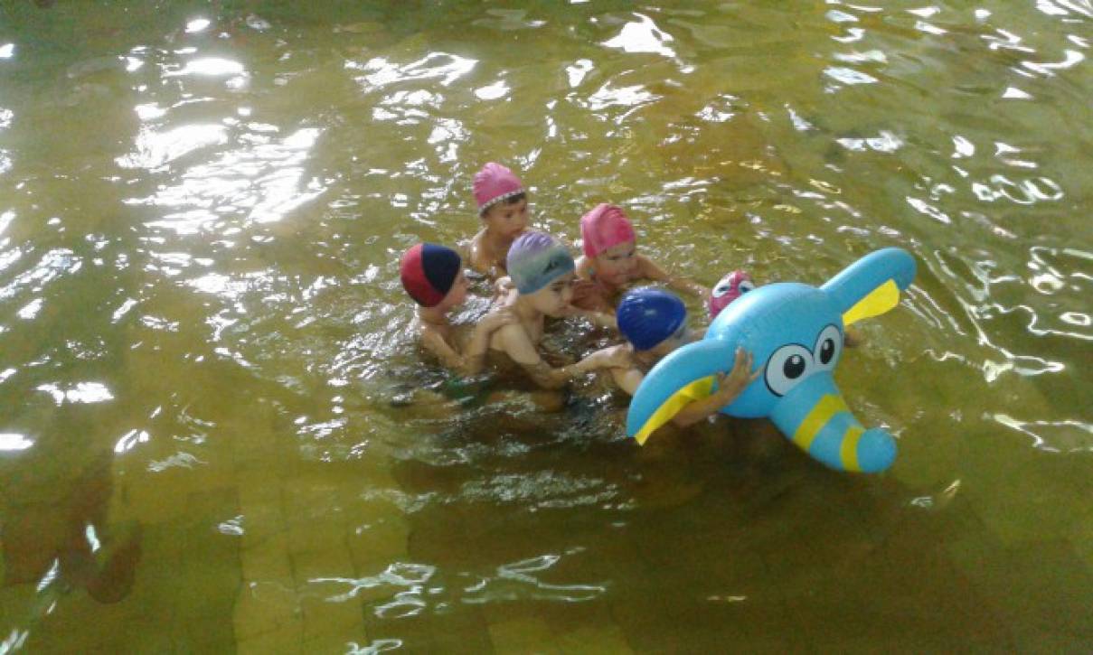 5. Катание на слоне. (дети встают друг за другом.впереди удерживают надувную голову слона, и змейкой передвигаются по бассейну)