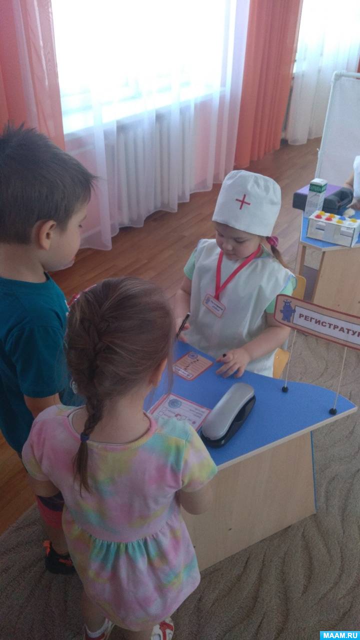 Оборудование и материалы: атрибуты для сюжетно-ролевой игры (халаты, шапочки, макет регистратуры и т. д.)