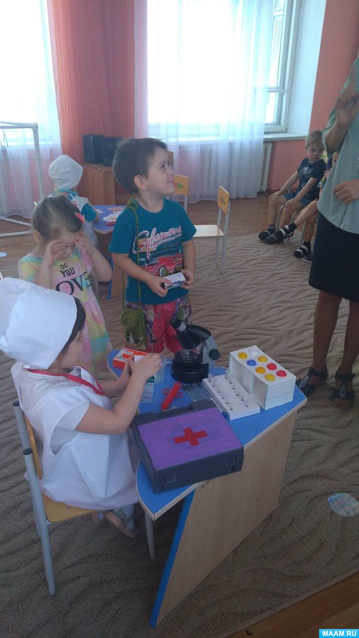 Воспитатель: Скажу вам по секрету, сегодня у нас открывается медицинский центр «Неболейка». Вести приём маленьких пациентов будет врач Мирослав. Встречать пациентов будет регистратор Арина. Продавать лекарства, которые выписал врач, будет фармацевт Юлианна, а делать уколы будет медсестра Кристина. Денис поведёт на приём дочь Вику, Андрюша - сына Ваню.