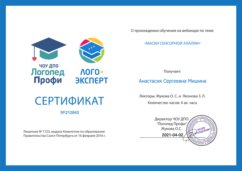 - 15-03-2021 Вебинар Жиковой О.С. и Леоновой З.Л. Маски сенсорной алалии. Диплом №212843
