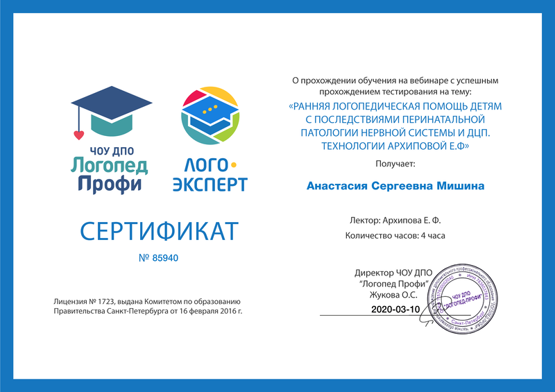 - 20-02-2020 Вебинар Архиповой Е.Ф.Ранняя логопедическая помощь детям с последствиями перинатальной патологии нервной системы и ДЦП. Диплом №85940
