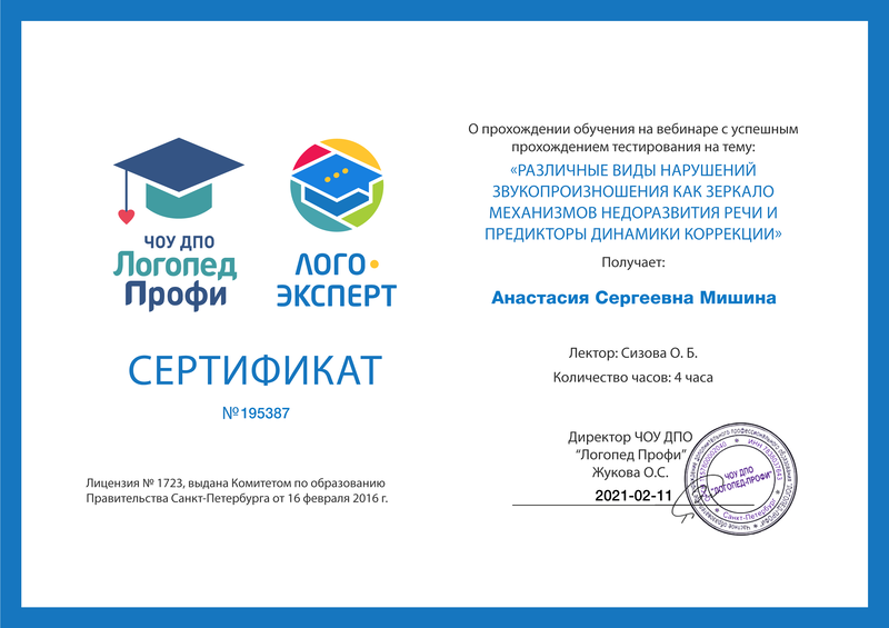 - 28-01-2021 Вебинар Сизовой О.Б. Различные виды нарушений звукопроизношения как зеркало механизмов недоразвития речи и предикторы динамики коррекции. Диплом №195387
