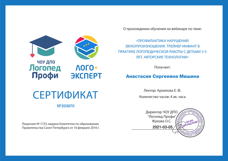 - 04-03-2021 Вебинар Архиповой Е.Ф. Профилактика нарушений звукопроизношения. Трейнер Инфант в практике логопедической работы с детьми 3-5 лет. Авторские т. Диплом №203870
