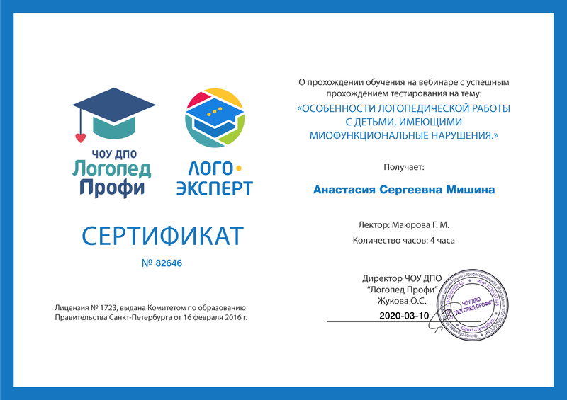 - 10-01-2019 Вебинар Маюровой Г.М.Особенности логопедической работы с детьми, имеющими миофункциональные нарушения. Диплом №82646