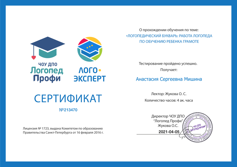 - 05-04-2021 Мастер-класс Жуковой О.С. Логопедический букварь: работа логопеда по обучению ребенка грамоте. Диплом №213470