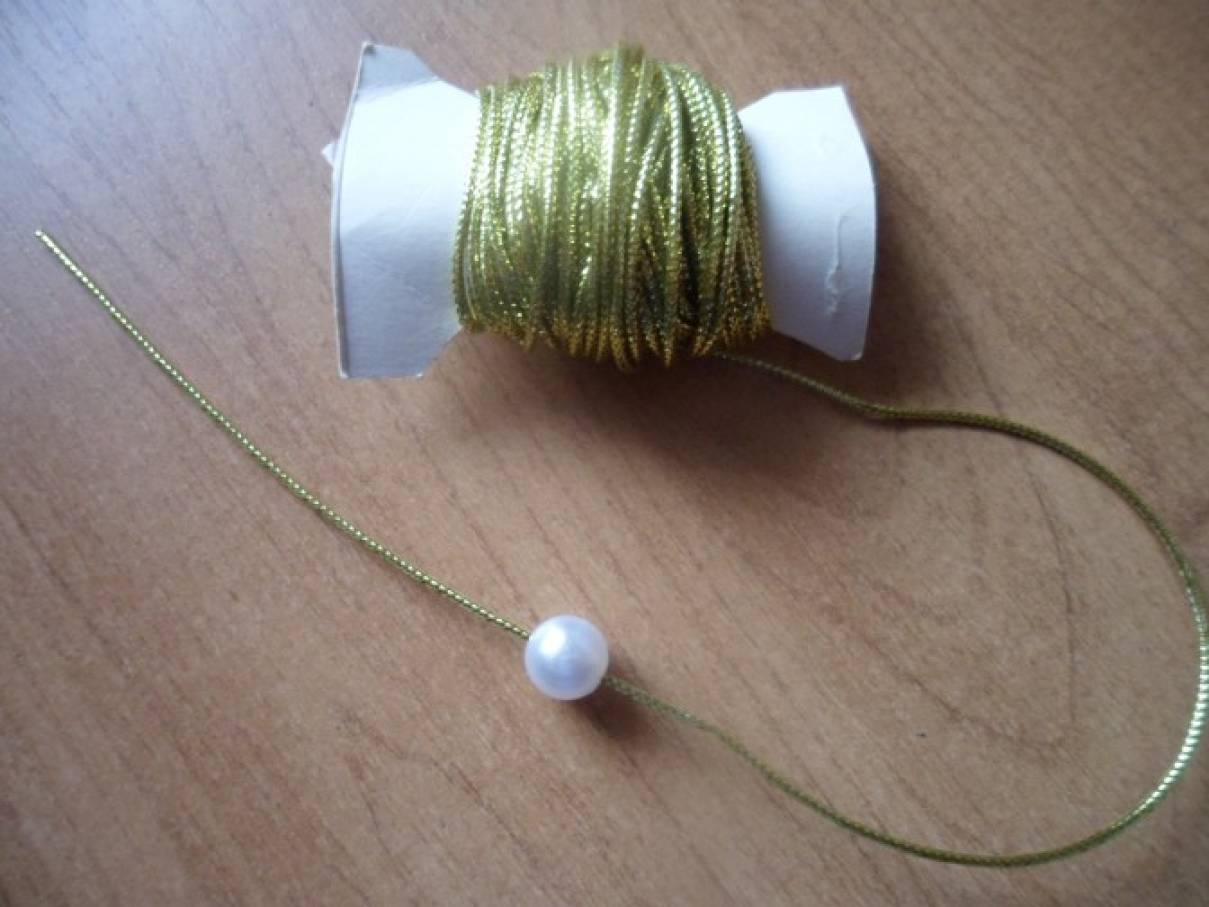 В бусину продеваем шнурок, завязываем и приклеиваем ее сверху (это голова ангелочка).