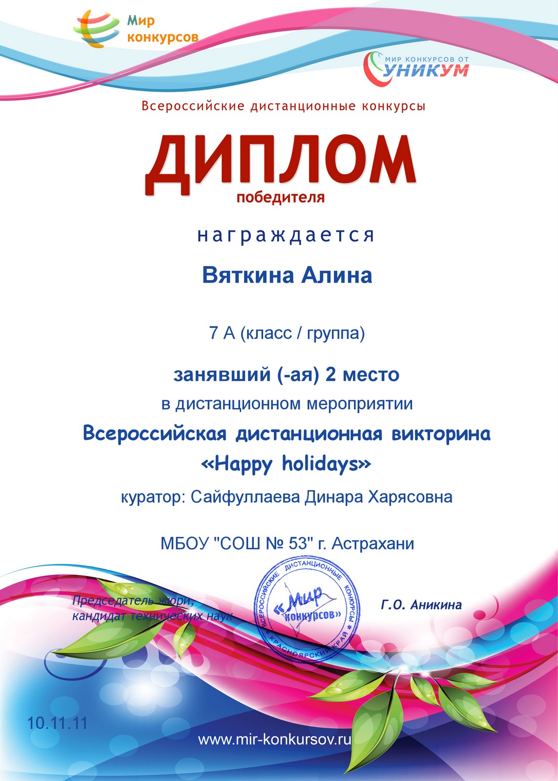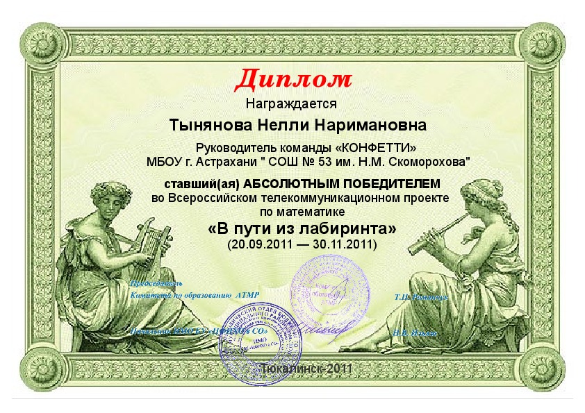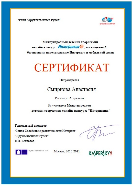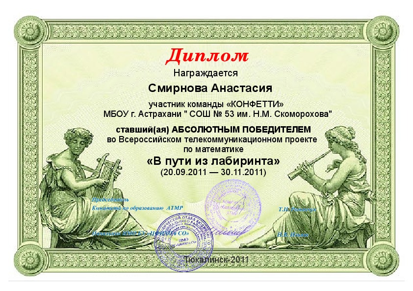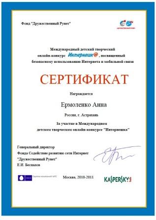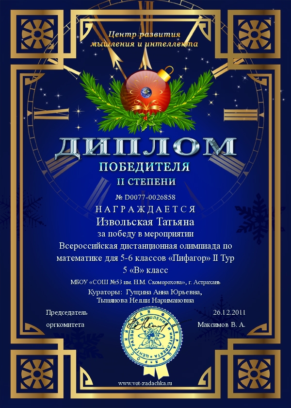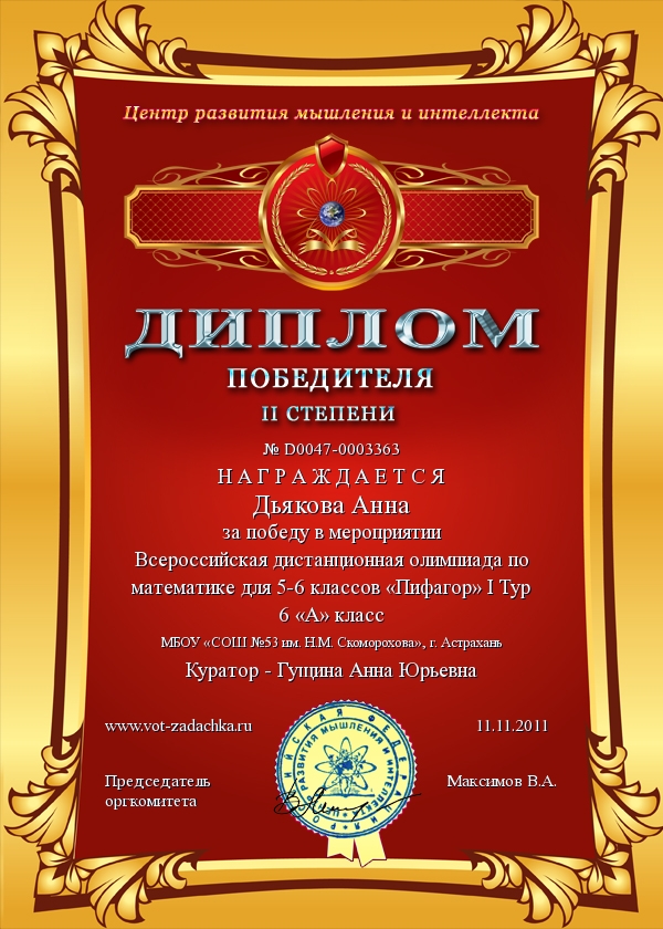Жаналиева Диана, 5 А класс - II место, Диплом II степени, Смирнова Анастасия, 5 А класс - II место, Диплом II степени,Фетисова Елена, 5 А класс - III место, Диплом III степени,Дьякова Анна, 6 А класс - II место, Диплом II степени,Никитенко Алексей, 6 А класс - III место, Диплом III степени,Ермоленко Анна, 6 А класс - III место, Диплом III степени,Извольская Татьяна, 6 А класс - III место, Диплом III степени,Сертификаты участника олимпиады получили: