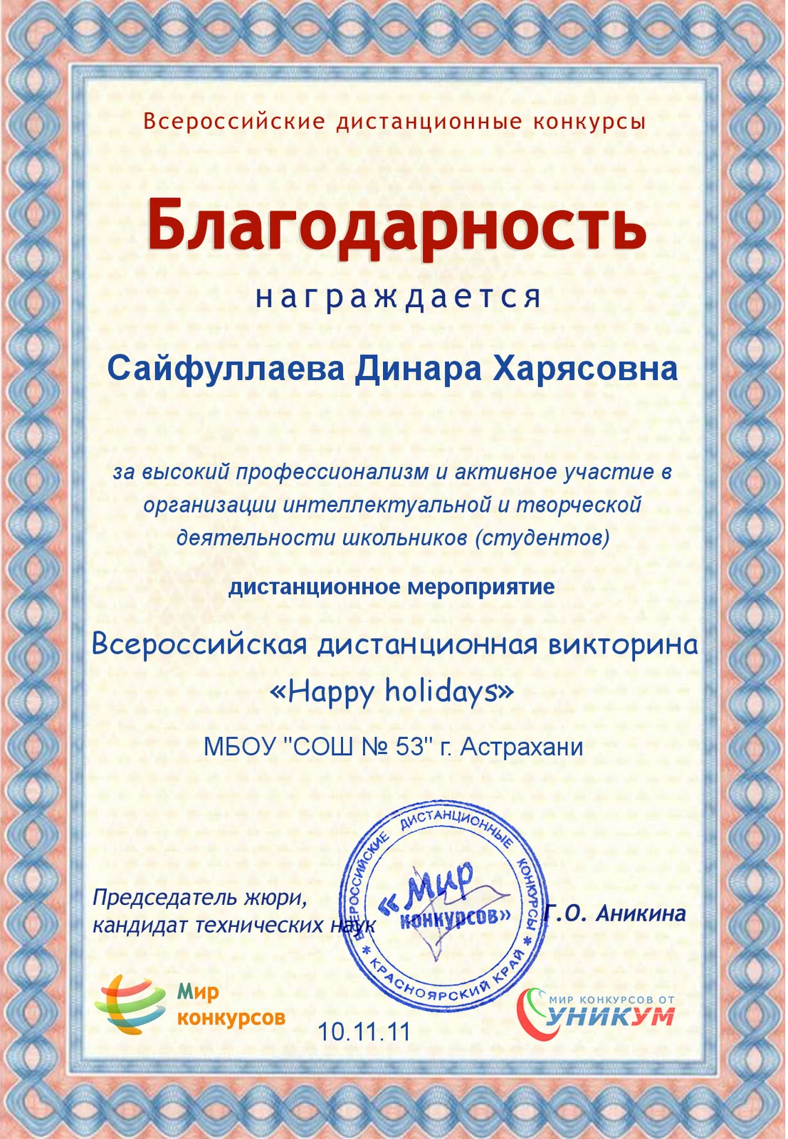 III место Смирнова Анастасия, МОУ«СОШ № 53», г. Астрахань, 5 Акласс – 52 балла.