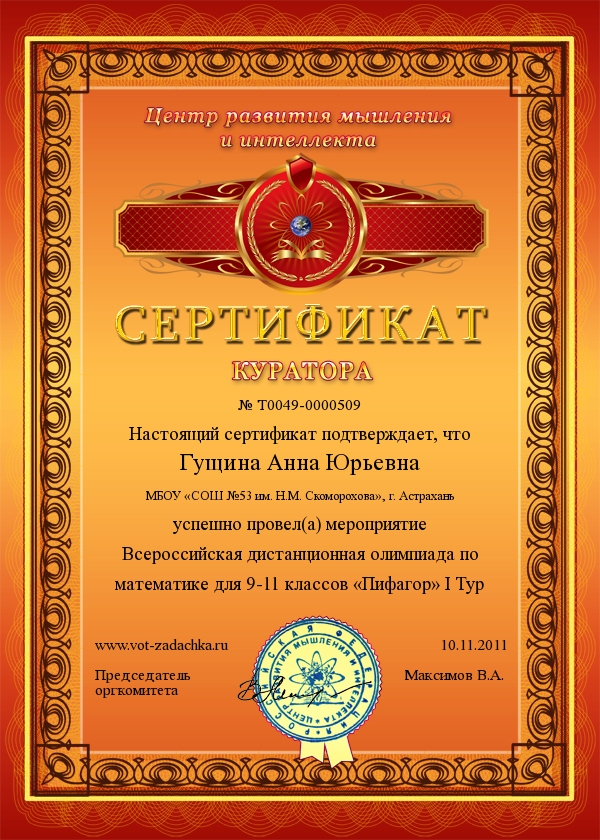 II место Ерёменко Сергей, МОУ«СОШ № 53», г. Астрахань, 5 А класс – 53 балла.