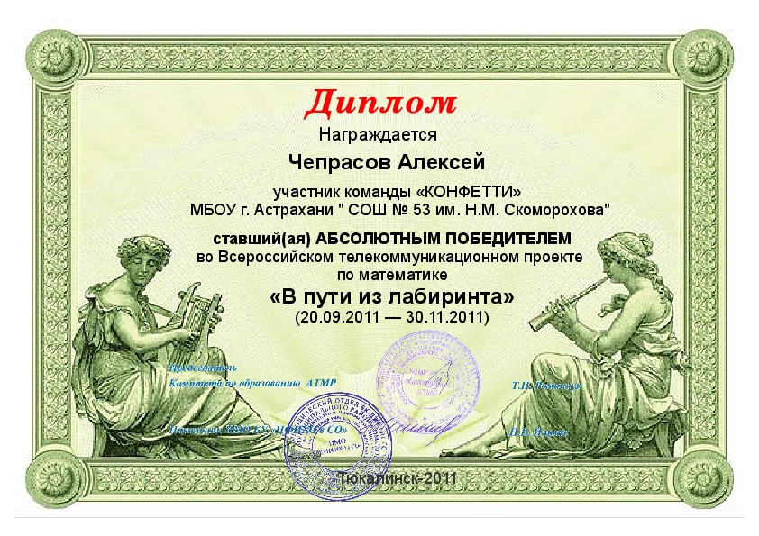 Городской интеллектуальный турнир " Что? Где? Когда?" ДЕБЮТ 2011 - Диплом III степени (среди школьных команд Трусовского района). Команда "Супермены" в составе:Ерёменко Юлия, Панасенко Максим, Щербакова Полина, Карпухин Сергей, Сторублёвская Мария, Барышникова Анастасия.