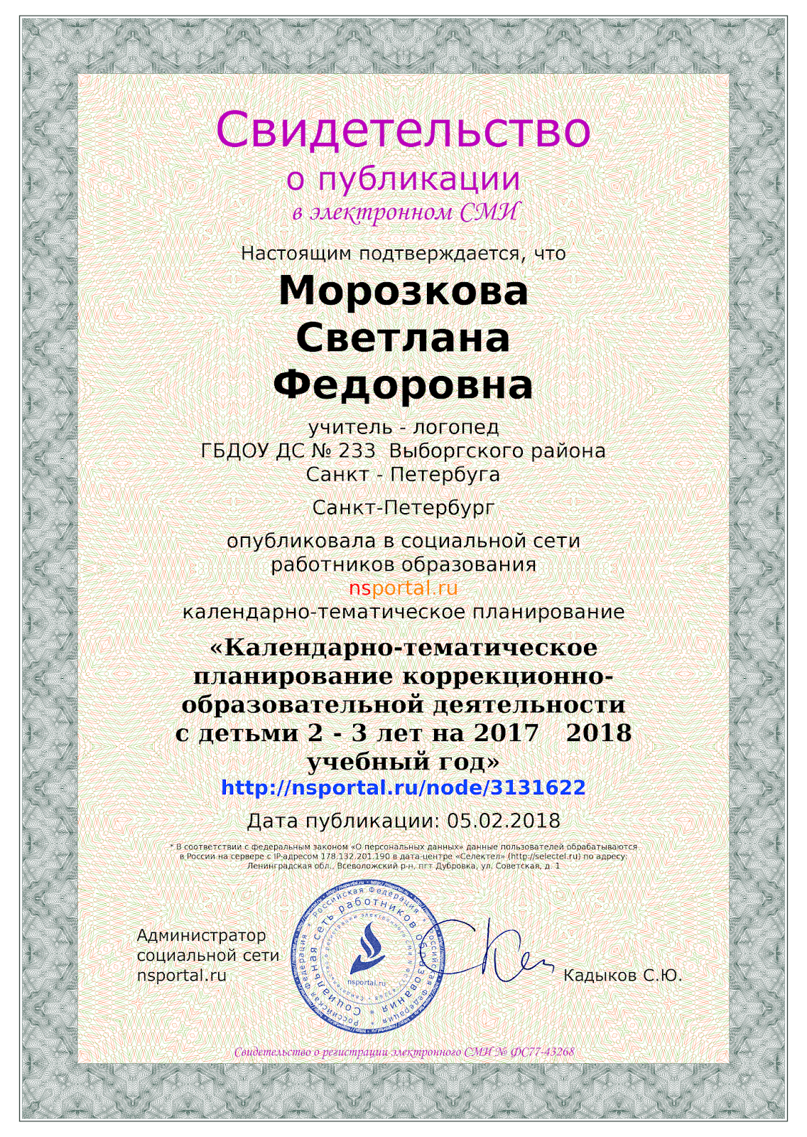 "Календарно - тематическое планирование коррекционно - образовательной деятельности с детьми 2-3 лет" / Свидетельство о публикации в социальной сети работников образования, материал опубликован 5 февраля 2018 г., доступен https://nsportal.ru/detskiy-sad/logopediya/2018/02...