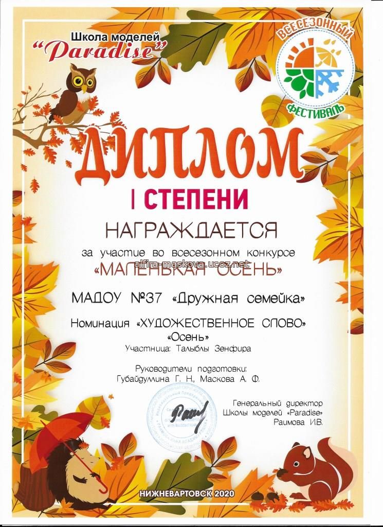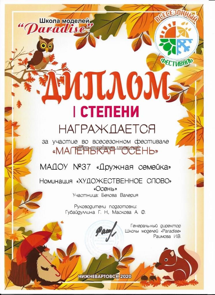 Диплом 1 степени в городском всесезонном фестивале "Маленькая осень"в номинации "Художественное слова" (Просмотр),(Просмотр),(Просмотр)