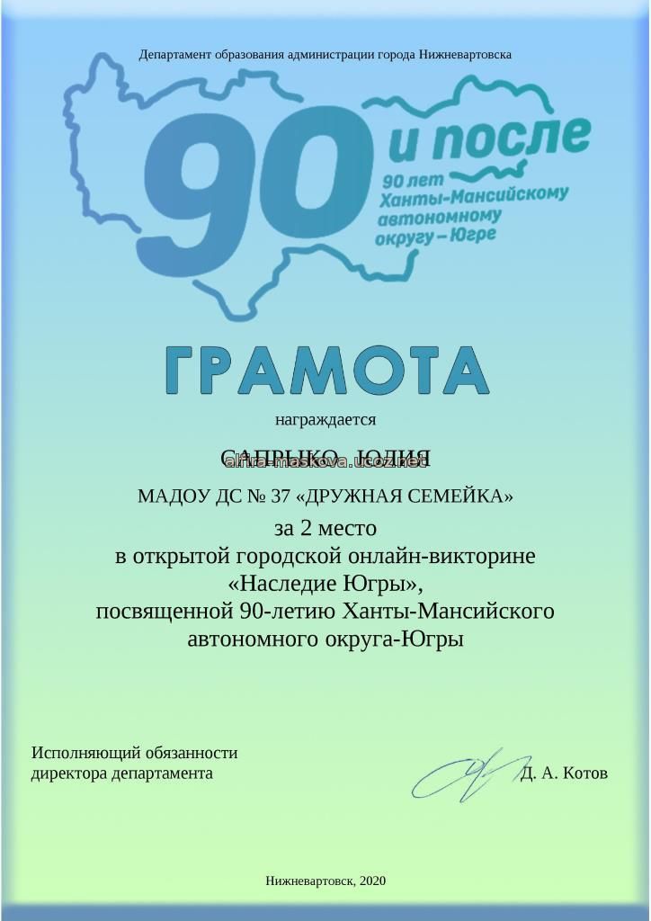Грамота 2 место в открытой городской онлайн-викторине "Наследие Югры", посвященное 90-летию ХМАО-Югры (Просмотр), (Просмотр), (Просмотр), (Просмотр)