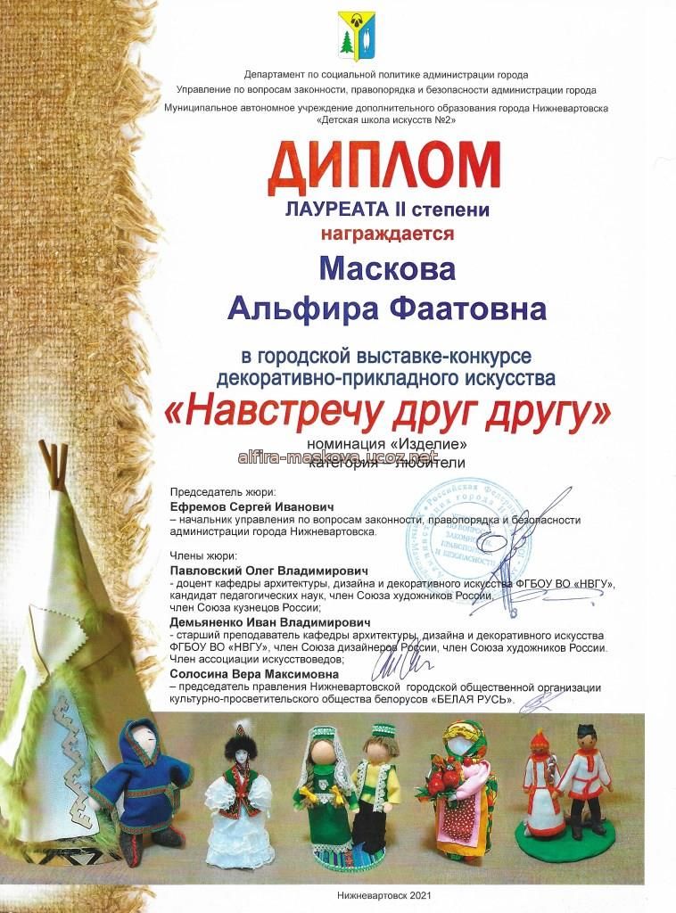 Диплом лауреата 2 степени в городской выставке-конкурсе ДПИ "Навстречу друг другу" в номинации "Изделие" (Просмотр)