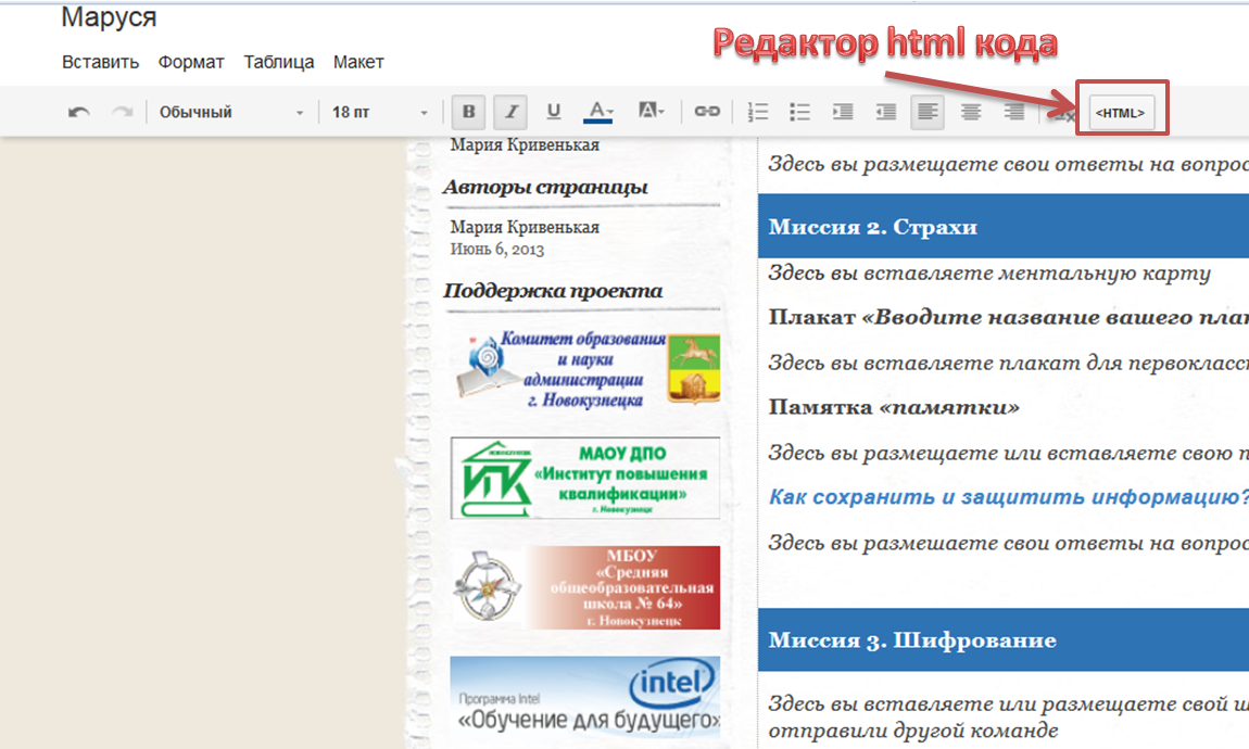 а) Открываем страницу, в которою мы хотим вставить ментальную карту. Включаем редактор страниц, нажимая на карандашик в верхнем правом углу. Выбираем функцию редактирование html кода. Будь очень внимательны при работе в этом редакторе!