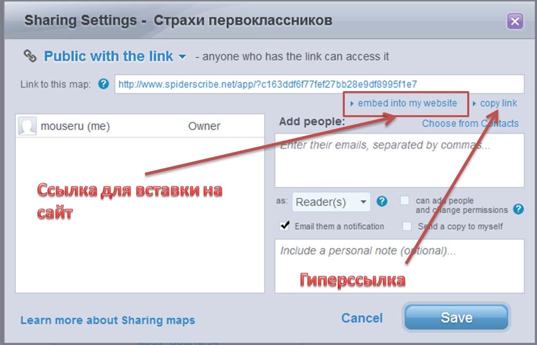 б) В появившемся окне нажимаем на стрелочку с надписью embed into my website (вставлять в мою домашнюю страницу), или можно вставить, используя гиперссылку на тексте.