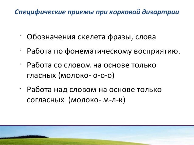 - 100. Специфические приемы при корковой дизартрии • Обозначения скелета фразы, слова • Работа по фонематическому восприятию. • Работа со словом на основе только гласных (молоко- о-о-о) • Работа над словом на основе только согласных (молоко- м-л-к)