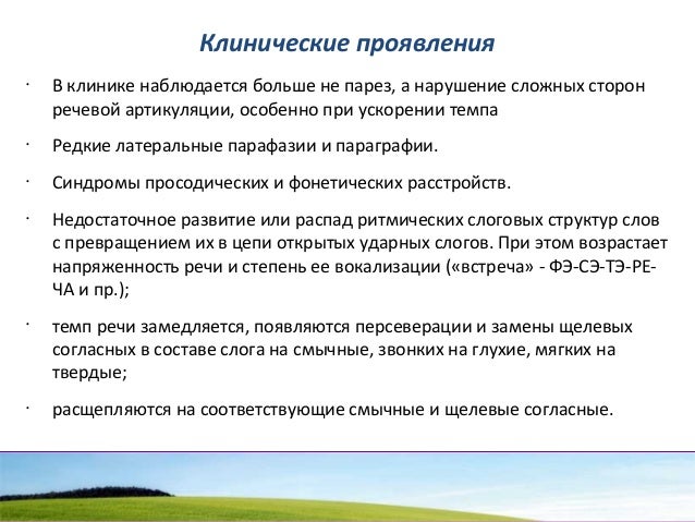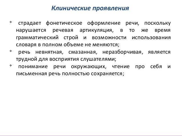 - 24. Клинические проявления v страдает фонетическое оформление речи, поскольку нарушается речевая артикуляция, в то же время грамматический строй и возможности использования словаря в полном объеме не меняются; v речь невнятная, смазанная, неразборчивая, является трудной для восприятия слушателями; v понимание речи окружающих, чтение про себя и письменная речь полностью сохраняется;
