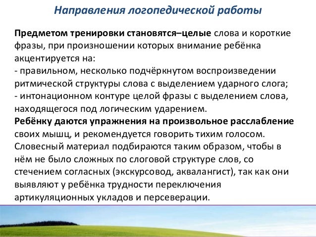 - 102. Направления логопедической работы Предметом тренировки становятся–целые слова и короткие фразы, при произношении которых внимание ребёнка акцентируется на: - правильном, несколько подчёркнутом воспроизведении ритмической структуры слова с выделением ударного слога; - интонационном контуре целой фразы с выделением слова, находящегося под логическим ударением. Ребёнку даются упражнения на произвольное расслабление своих мышц, и рекомендуется говорить тихим голосом. Словесный материал подбираются таким образом, чтобы в нём не было сложных по слоговой структуре слов, со стечением согласных (экскурсовод, аквалангист), так как они выявляют у ребёнка трудности переключения артикуляционных укладов и персеверации.