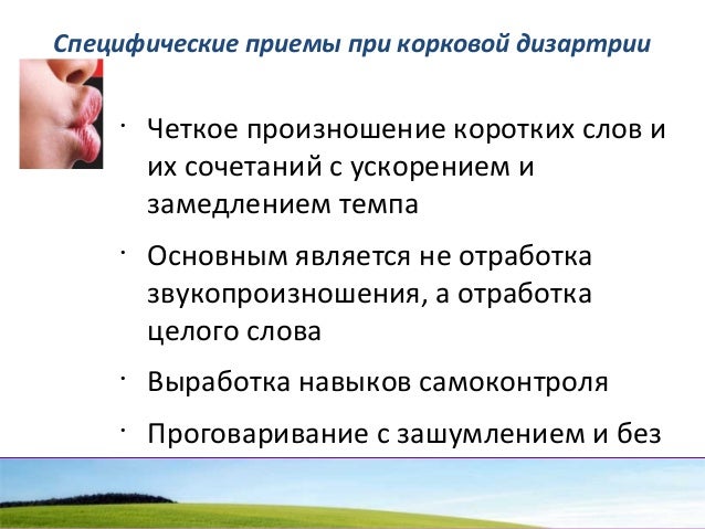 - 103. Специфические приемы при корковой дизартрии • Четкое произношение коротких слов и их сочетаний с ускорением и замедлением темпа • Основным является не отработка звукопроизношения, а отработка целого слова • Выработка навыков самоконтроля • Проговаривание с зашумлением и без зашумления.