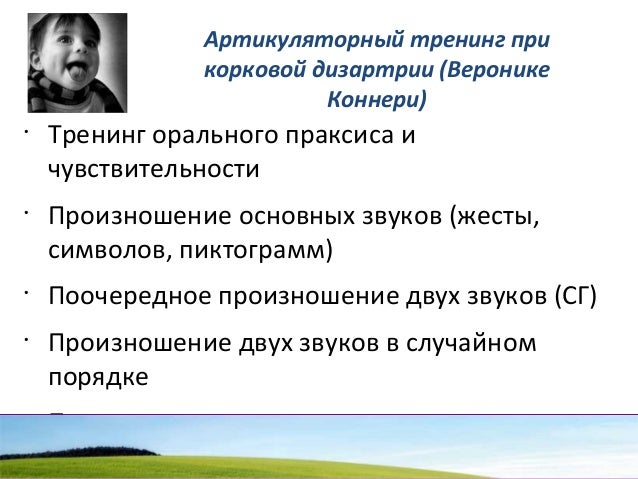- 104. Артикуляторный тренинг при корковой дизартрии (Веронике Коннери) • Тренинг орального праксиса и чувствительности • Произношение основных звуков (жесты, символов, пиктограмм) • Поочередное произношение двух звуков (СГ) • Произношение двух звуков в случайном порядке • Последовательное произношение трех звуков