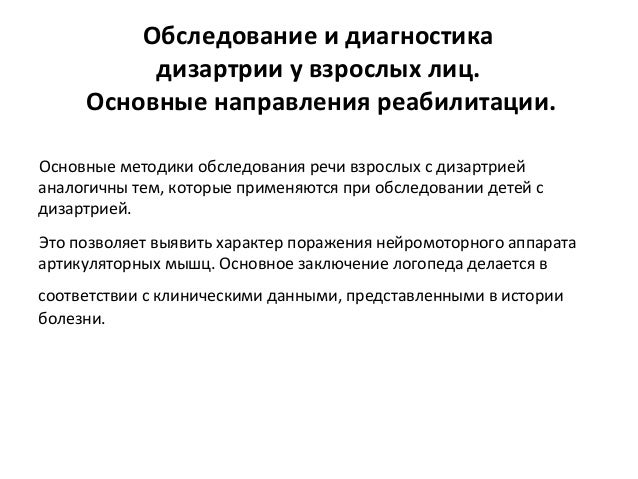 - 106. Обследование и диагностика дизартрии у взрослых лиц. Основные направления реабилитации. Основные методики обследования речи взрослых с дизартрией аналогичны тем, которые применяются при обследовании детей с дизартрией. Это позволяет выявить характер поражения нейромоторного аппарата артикуляторных мышц. Основное заключение логопеда делается в соответствии с клиническими данными, представленными в истории болезни.