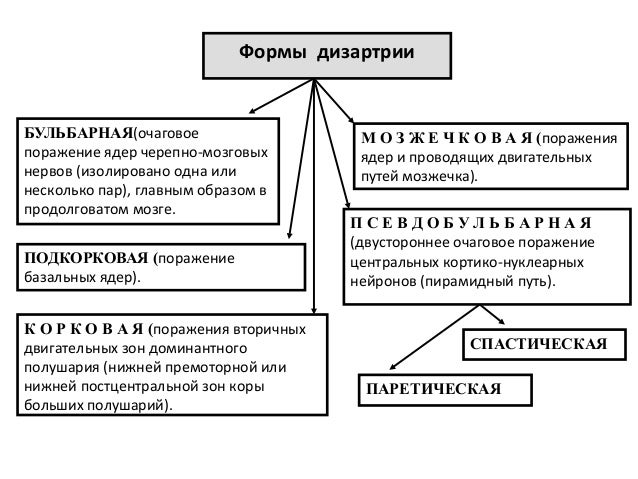 - 11. Формы дизартрии БУЛЬБАРНАЯ(очаговое поражение ядер черепно-мозговых нервов (изолировано одна или несколько пар), главным образом в продолговатом мозге. ПОДКОРКОВАЯ (поражение базальных ядер). К О Р К О В А Я (поражения вторичных двигательных зон доминантного полушария (нижней премоторной или нижней постцентральной зон коры больших полушарий). М О З Ж Е Ч К О В А Я (поражения ядер и проводящих двигательных путей мозжечка). П С Е В Д О Б У Л Ь Б А Р Н А Я (двустороннее очаговое поражение центральных кортико-нуклеарных нейронов (пирамидный путь). СПАСТИЧЕСКАЯ ПАРЕТИЧЕСКАЯ