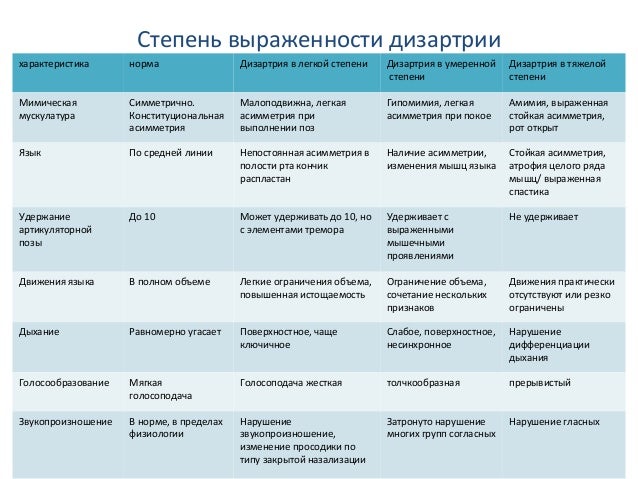 - 12. Степень выраженности дизартрии характеристика норма Дизартрия в легкой степени Дизартрия в умеренной степени Дизартрия в тяжелой степени Мимическая мускулатура Симметрично. Конституциональная асимметрия Малоподвижна, легкая асимметрия при выполнении поз Гипомимия, легкая асимметрия при покое Амимия, выраженная стойкая асимметрия, рот открыт Язык По средней линии Непостоянная асимметрия в полости рта кончик распластан Наличие асимметрии, изменения мышц языка Стойкая асимметрия, атрофия целого ряда мышц/ выраженная спастика Удержание артикуляторной позы До 10 Может удерживать до 10, но с элементами тремора Удерживает с выраженными мышечными проявлениями Не удерживает Движения языка В полном объеме Легкие ограничения объема, повышенная истощаемость Ограничение объема, сочетание нескольких признаков Движения практически отсутствуют или резко ограничены Дыхание Равномерно угасает Поверхностное, чаще ключичное Слабое, поверхностное, несинхронное Нарушение дифференциации дыхания Голосообразование Мягкая голосоподача Голосоподача жесткая толчкообразная прерывистый Звукопроизношение В норме, в пределах физиологии Нарушение звукопроизношение, изменение просодики по типу закрытой назализации Затронуто нарушение многих групп согласных Нарушение гласных