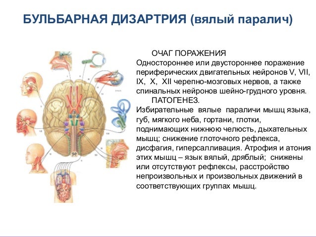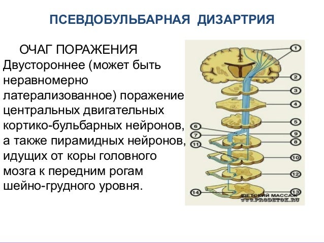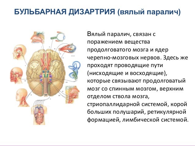 - 13. БУЛЬБАРНАЯ ДИЗАРТРИЯ (вялый паралич) Вялый паралич, связан с поражением вещества продолговатого мозга и ядер черепно-мозговых нервов. Здесь же проходят проводящие пути (нисходящие и восходящие), которые связывают продолговатый мозг со спинным мозгом, верхним отделом ствола мозга, стриопаллидарной системой, корой больших полушарий, ретикулярной формацией, лимбической системой.